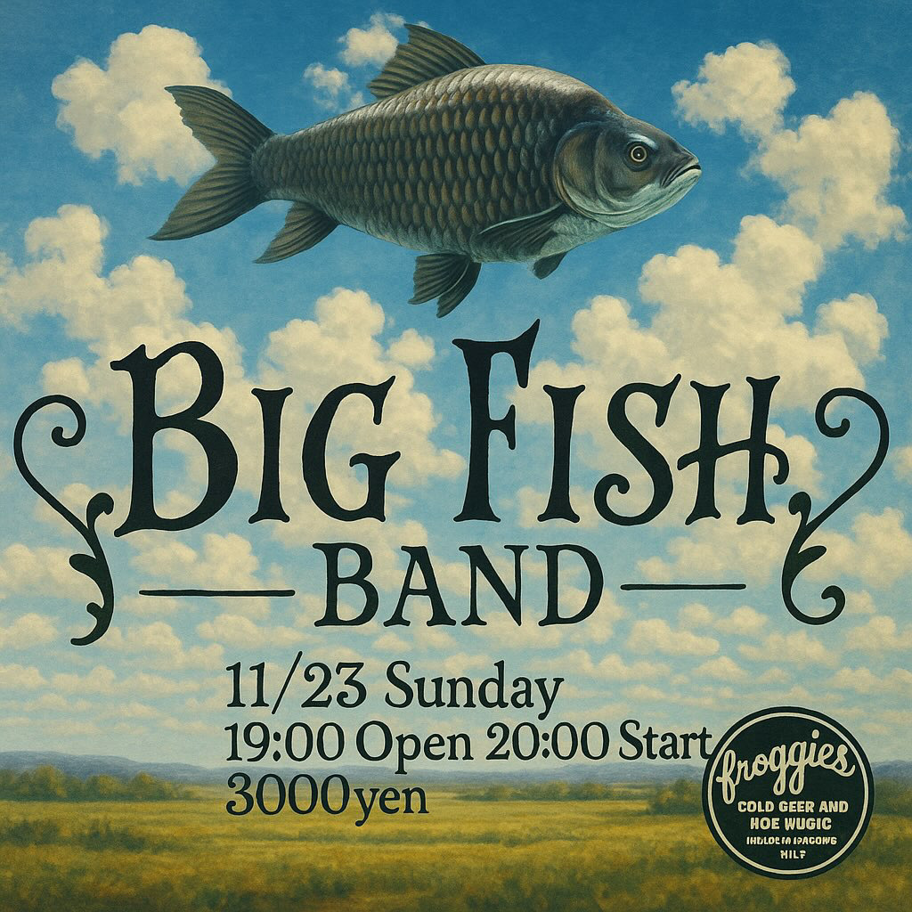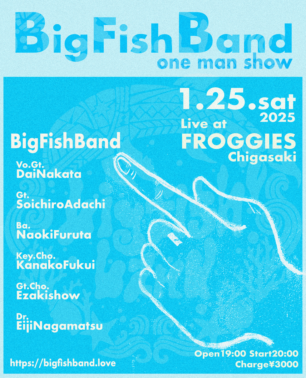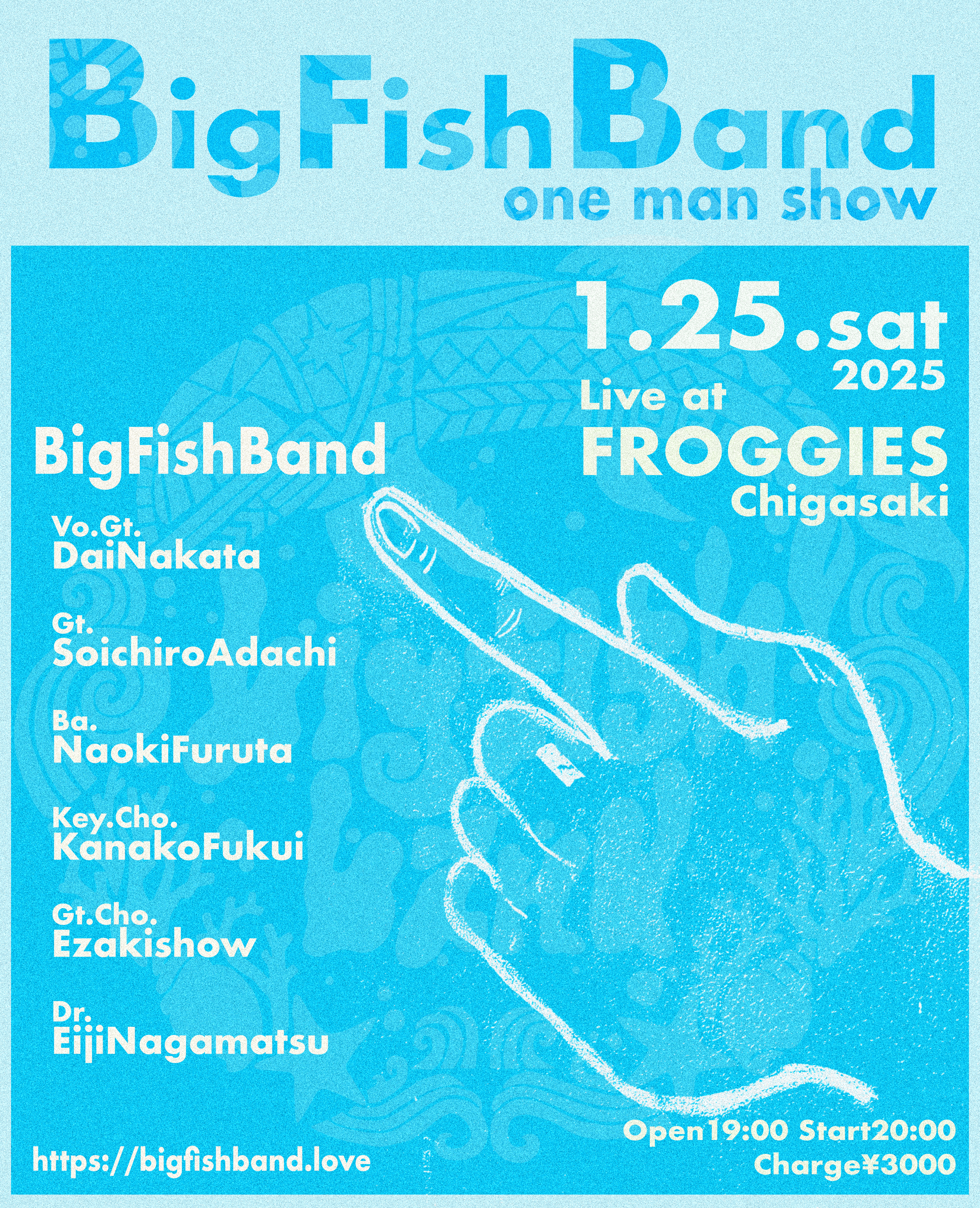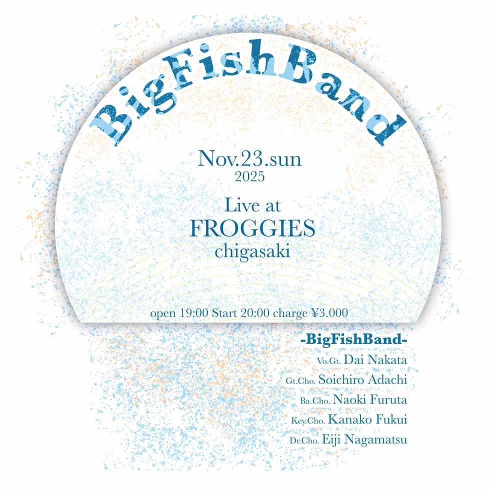 BigFishBand 大きな魚が跳ねて 水面に出来た大きな波紋 広がる音吸い込まれる世界 愛の大きさを知らずに食べてしまった魚たち Gt.Vo. Dai Nakata Gt.Cho. Soichiro 'PANIC' Adachi Ba.Cho. Naoki Furuta Key.Cho .Kanako Fukui Dr.Cho. Eiji Nagamatsu LIVE SHOW 11.23.2025.Sun.茅ヶ崎 FROGGIES BigFishBandone man show LIVE-BigFishBand- open19:00 start20:00charge¥3000 Past Date