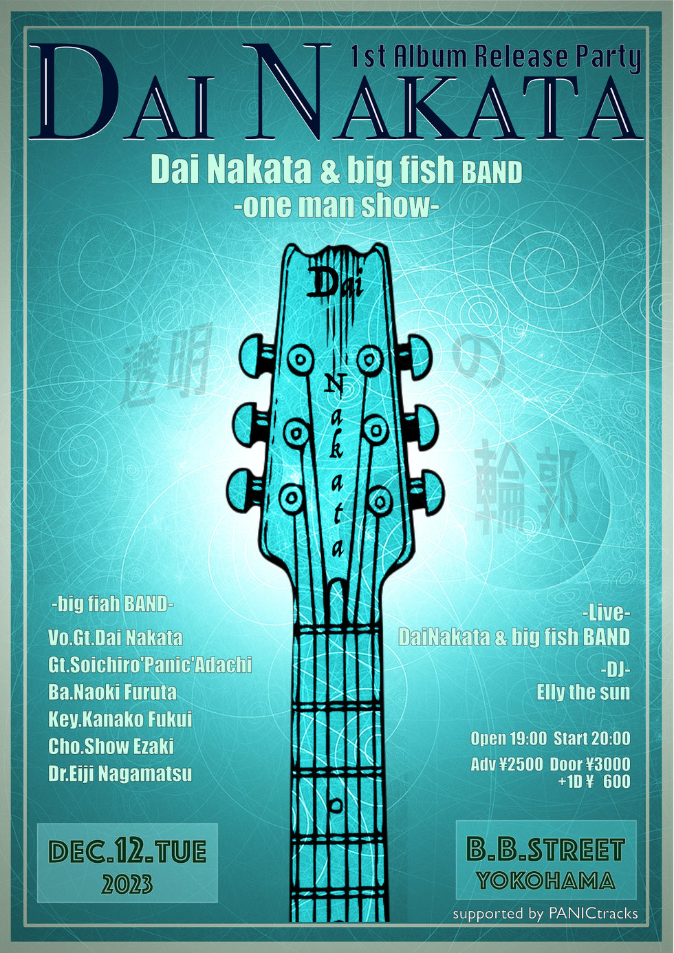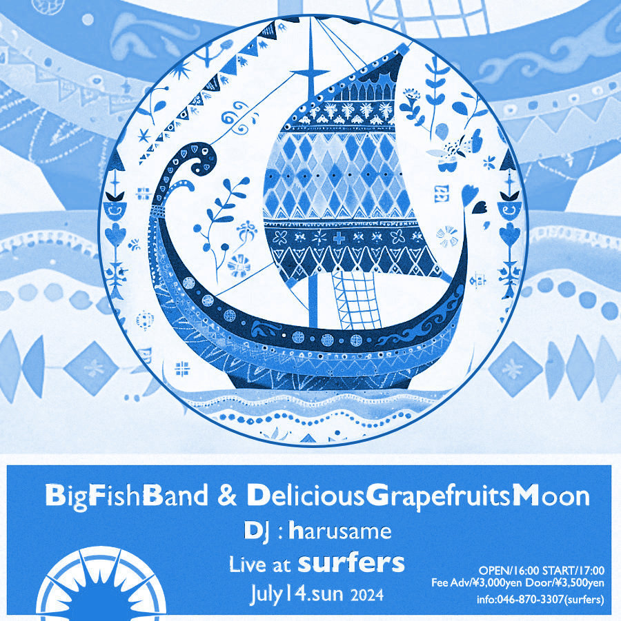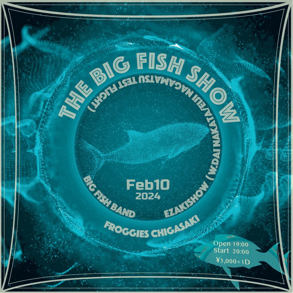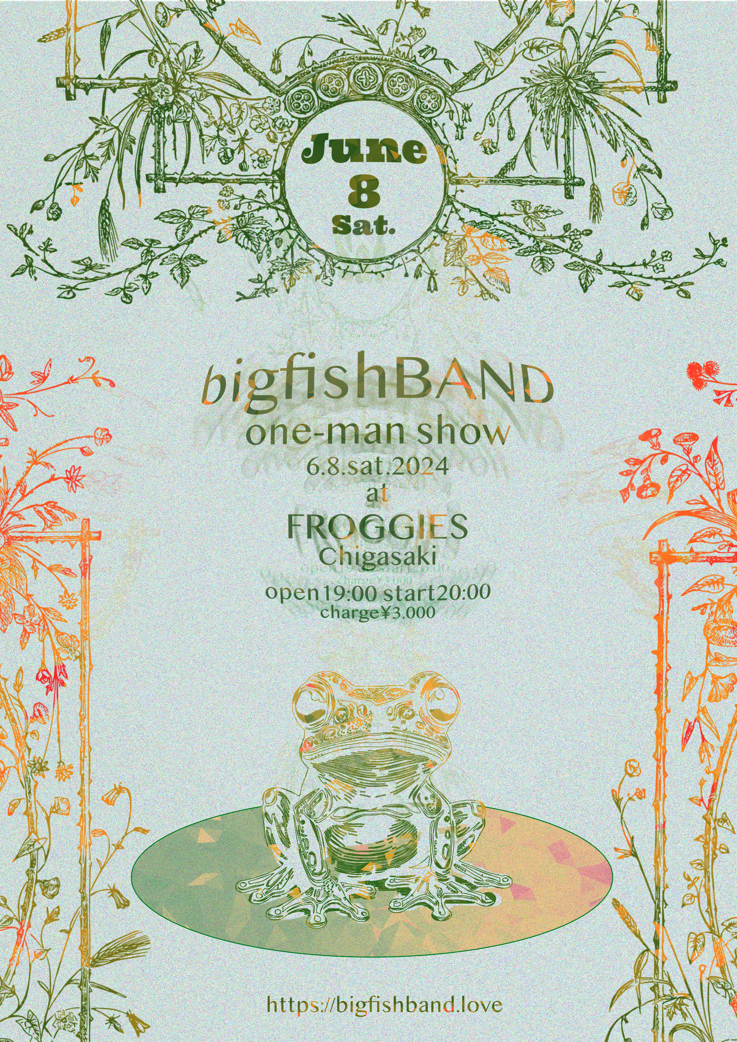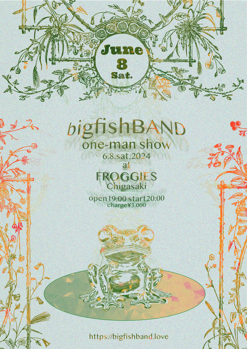 BigFishBand 大きな魚が跳ねて 水面に出来た大きな波紋 広がる音吸い込まれる世界 愛の大きさを知らずに食べてしまった魚たち Gt.Vo. Dai Nakata Gt.Cho. Soichiro 'PANIC' Adachi Ba.Cho. Naoki Furuta Key.Cho .Kanako Fukui Dr.Cho. Eiji Nagamatsu LIVE SHOW 11.23.2025.Sun.茅ヶ崎 FROGGIES BigFishBandone man show LIVE-BigFishBand- open19:00 start20:00charge¥3000 Past Date